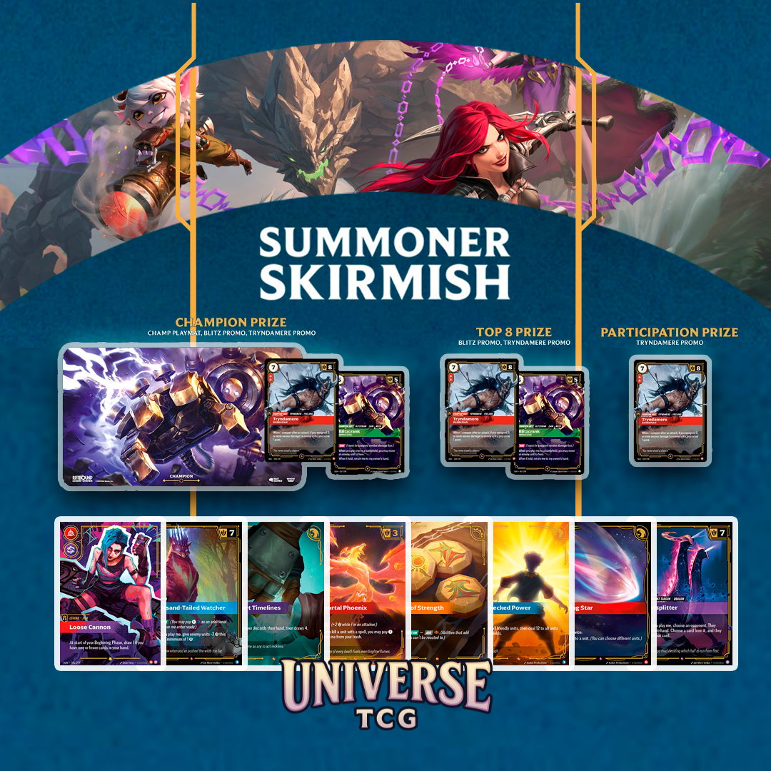 Participa en el Saturday Morning Summoner Skirmish de Riftbound en Universe TCG, en Mollet del Vallès (Barcelona). Un evento competitivo oficial pensado para jugadores que quieren poner a prueba sus mazos en formato Constructed 1v1 y competir por promos exclusivas, cartas premium, un playmat de campeón y el bye para un regional.
